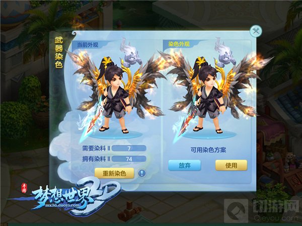 在本周四更新的全新版本中,武器染色取消了双附加属性限制条件,任何武器都能进行染色,各位少侠不再需要打造双附加属性武器。同翅膀染色和招式染色一样,花费一定量的染料即可染色,染色完成后,少侠可根据自身需求保存染色,挑选心仪的染色方案。