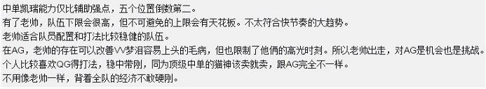 但有些观众给出了不同的看法,认为中单在比赛中的凯瑞能力仅仅高于辅助。老帅的加入,虽然让GK的下限增加了不少,能跃升为KPL中等战队。但想要成为强队,提升队伍上限,还是要看老帅与GK的磨合程度才行。