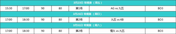 在第二周期中的比赛,九五将迎战AG、KB以及情久,三支强队的对决对九五而言是极大的考验。在上赛季中,与这三支战队的对战,均以失败告终。因此在第二周期的比赛中,新人上场的九五能否有应对的能力还有待考证,在上赛季中九五由于应对强队的后力不足导致他们积分榜的位置有所下降,新赛季中能否有新的调整则是他们获胜的关键。