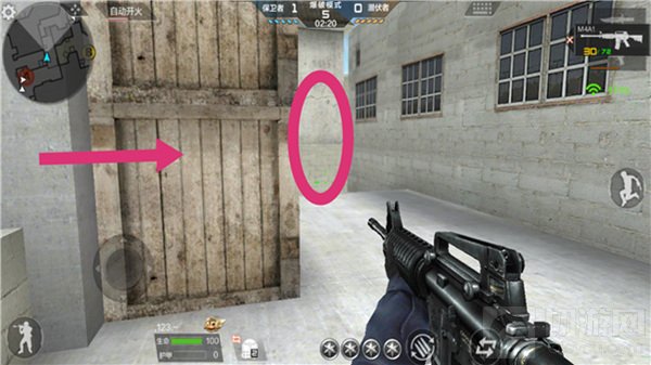 这张地图的B大道拐弯非常多不适合狙击步枪发挥,所以只能依靠步枪进行防守。如上图所示,保卫者来到这处位置的速度快于对方,建议这个位置由两名队员防守(基本不占地形的优势)。在上图的位置提前瞄准,敌人露头后点射集火攻击。有个小技巧是上图箭头所指处有一个木制小门,这个门是可以被子弹打穿的,适当的点几发子弹有意想不到的效果。