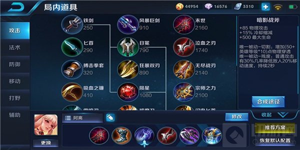 暗影战斧增加85点物理伤害破甲能力、15%的冷却缩减和500点最大生命,能为公孙离在中后期提供破甲能力和更高的伤害。