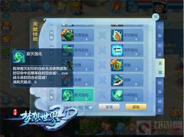 道士作为《梦想世界3D》里兼具封印和治疗能力的职业,继承了《梦想世界》端游中儒法的玩法核心,但是不少道士玩家反馈到道士的自封让封道玩起来很难受,现在福音来了!即将更新的75级天赋“寂灭强化”可以使被乾坤寂灭封印的目标无法使用道具,并且封印后自封的回合有概率减少1回合,在pve战斗中自封回合必定减少1回合,这就相当于道士也有了连续封印的能力!学习了这个天赋后,相信很多封道玩家们也能在pve的中找到自己的定位了!