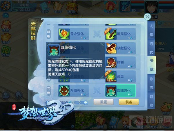 术士作为《梦想世界3D》中的以召唤和防毒为主要输出手段的法系输出,由于缺少像万法归一、冰龙咆哮这种高效率的输出技能,许多术士玩家一直认为法师才是亲儿子,其实不然。本次更新的75级天赋降临强化,在恶魔降临状态下,使用恶魔献祭有概率额外消耗一个恶魔攻击敌方目标并造成50%的伤害,极大程度上增加的术士的瞬间爆发伤害。