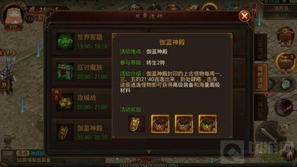 伽蓝神殿的进入门槛较高,需要玩家达到转生2转时候才会开放,在如此严苛的要求之下,自然也会有着更加丰富的奖励。珈蓝神殿的开放时间为只有每周一、三、五晚上21:40,开放时间也仅有30分钟,想要获得高阶装备的玩家一定不要错过。