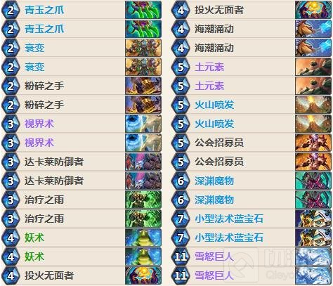 我们起手找青玉之爪、粉碎之手,手牌特别好的话可以留公会招募员。对上快攻卡组时可以留一张达卡莱防御者,土元素也可以留一下;对上控场卡组时可以留视界术,投火无面者也可以直接留下,起手好的话可以留一张小型法术蓝宝石。