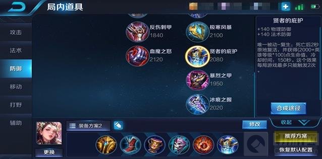 最后一件装备选择贤者的庇护,不仅仅提供了双抗,还能让杨玉环死亡2秒后原地复活,提高了杨玉环的容错率,避免走位失误直接被秒无法为队友提供回复及控制,2次复活效果触发后可根据敌方阵容选择其他防御性装备(法术装备)。