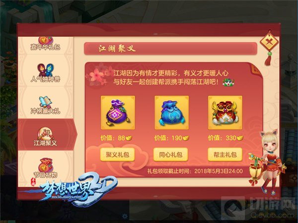 江湖因为有情才更精彩,有义才更暖人心。新服开启后,玩家创建或加入帮派,并达成一定条件即可领取礼包。礼包分为3种类型,每个礼包只能领取1次。