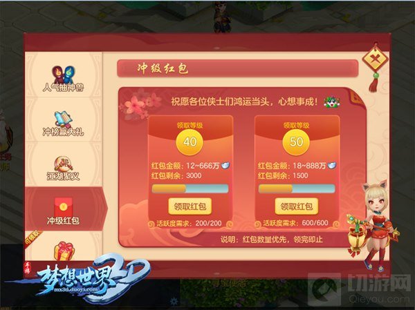 新服开启后,玩家达到指定等级和活跃度要求后,即可开启手气红包,随机获得银两奖励,最高可获得888万银两。等级达到40级且累计活跃度满足200时,可领取第1个红包,限量3000份。等级达到50级且累计活跃度达到600时,可领取第2个红包,限量1500份。