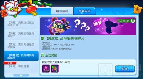 4月20日-4月26日,凡是参与进行巴巴六的对决的玩家都将能够获得奖励!没有英雄限制,不问宠物选择,更不要求取得胜利,只要选择进入巴巴六的对决,即可获得奖励,同时完成对应次数可以领取对应奖励。