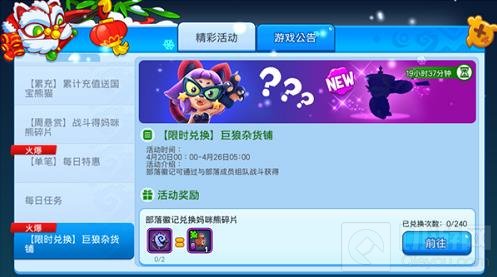 4月20日-4月26日,巨狼杂货铺再次更新店铺商品,即刻起使用部落徽记能够在活动期间现实兑换宠物妈咪熊与吃瓜群众碎片,技能龙卷风、勾斧与英勇一跃碎片,同时也可选择兑换消耗物品烤鸡和迷幻菇。