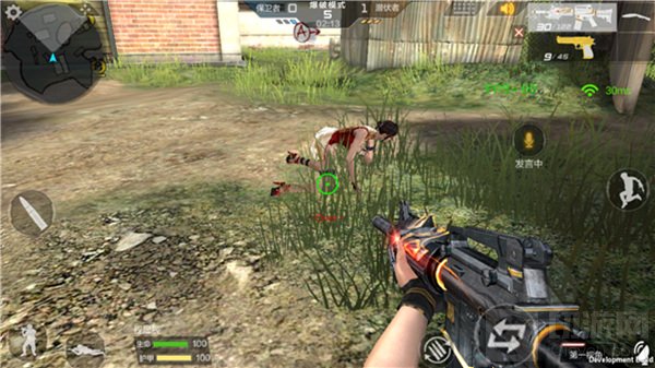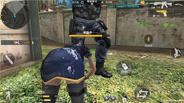 写实爆破中比较有意思的玩法,就是类似吃鸡模式中的救援。玩家第一次血量被打为0的时候是会倒地的,2点生命值2点生命值的扣,直到被扣到0的时候才会死亡。只要在这之前有队友来救你,并通过救援时间把你救活你就可以复活,当然了复活后的血量并不多,只有20%。20%的血量也是可以骚一波的,说不定就是这个20%把战局扳回来。