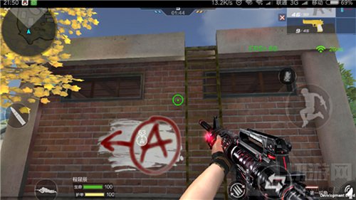潜伏者的基地,也就是刚复活的时候。那个地方有一个梯子,小伙伴们可能没太注意。如图。这个房子的外围搭建了一个梯子,墙上画着一个箭头和一个A字,这个是给潜伏者指向A点的标志,潜伏者按照指示走过去就到了。回归正题,小伙伴们看这个梯子,是可以上到二楼的。为什么要上二楼呢,居高临下杀敌非常有效。