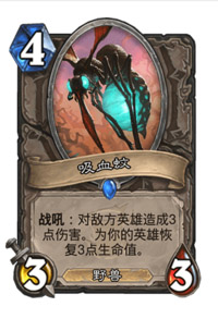 一张拥有3点过墙伤害,以及三点回复能力的野兽,绝对是值得一带的,虽然说33站场身材并不好,但是同样可以配合驯兽师、土狼、杀戮命令等,还很符合这套牌的抢血特性的,这张卡是作为一张摇摆卡,如果实战发现术士很多,39墙难过,可以把蚊子换成猫头鹰来过墙,即这个卡位可以根据环境调整。