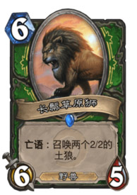中速猎怎么能少了狮子呢?作为猎人上古传承下来的橙卡,狮子的站场能力不用多解释,即便现在沉默很多,狮子却不那么怕,处理不了就是6点伤害,试问有几个职业能承受得起猎人的6点伤害,还不慌的要死。因此必须满编。