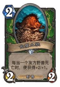 一直以来都是猎人很关键的一张卡,虽然本身基础身材不太好,但是因为猎人套牌野兽众多,土狼下场的回合基本上最少能成长一次变成43,由此评估的话,2费43,还带成长的野兽,真的是大赚,只有在场面完全被对手碾压的时候,才不好发挥,因为即便你有放狗但是解不掉对手场面情况下,一个土狼还是分分钟被解。但毕竟只是一个2费生物,还能要求什么呢?多数情况下配合场面野兽或者毒蛇陷阱都能成长一波变成超模身材。在这套牌中有时候是力挽狂澜、起死回生的存在。