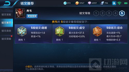 铭文解析:因为典韦是近战型英雄,而且需要持续输出才能将自身作用最大化,所以铭文建议主要增强自身的生存能力,其次提升自身物理攻击力和移动速度。