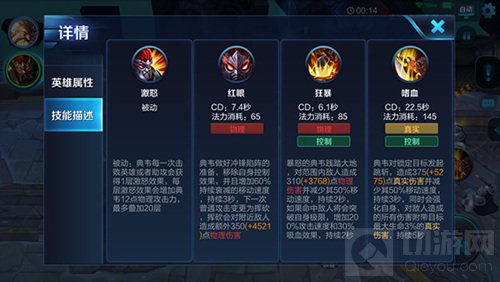 解析:典韦的二技能拥有增加攻击速度和吸血两大逆天效果,在被动叠加到一定数值后,再配合二技能,典韦能打出相当可观的伤害,而减速效果则加强了典韦的软控能力,能够减少被风筝的情况发生。