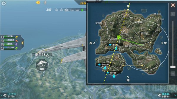 不管是什么模式,第一重要的肯定是降落点的选择。速战速决玩法为四排玩法,所以我们应该考虑一下队友的降落点位,最好是能够和队友降落在一起。但是如果发现队友特别分散的话,就只能靠自己了。由于在我们降落之前第一个安全区的范围就已经确定了,所以这时候最好是选择航线末端的安全区边缘附近的建筑群降落,你会发现全场120人只有大概10多个人会选择这里,敌人密度非常小。