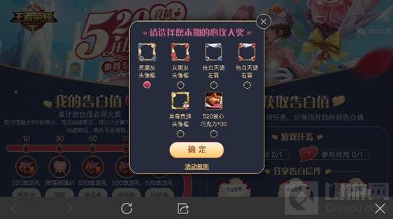 首次进入活动,可从5款头像框和520爱心巧克力*30(用于兑换新款情侣头像框)中选择一款作为自己本期的心仪大奖,当告白值达到奖励要求时即可领取!