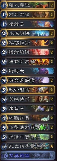 起手找蜡烛弓、陷阱、鹰角弓这些卡,稳定前期,特别对手是快攻的时候,炎术士必找,不然活不到你完成OTK,就功败垂成了。另外对阵快攻苦痛也可以考虑在1、2费有卡的情况下留一手,帮忙过渡,同时还能恶心对手那些1、2攻的随从。