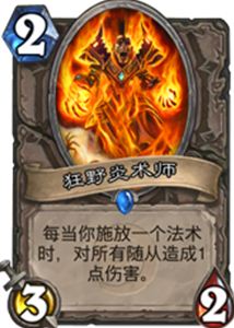 老司机都知道很久以前的猎人是带过这张卡的,当时叫“纵火猎”,解场能力贼强。如今也是同样的需求,为了解场,因为我们不像中速猎那样有充足的前期生物站场,所以为了场面不丢失太多(因为丢太多就凉了,猎人既没有强力解场能力,也没有多少回血手段),我们必须带一些解卡活下去,所以才选择了炎术士,冰冻、爆炸等陷阱进行配合,对前期场面进行控制,确保我们有能力活到DK变身。而炎术士在目前环境中还是比较好用的,特别是打骑士,一堆报告或者圣盾都要死绝,是我们解场必须带的卡。