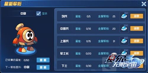 《赛尔号:无限宇宙》的军衔分为多个等阶,从最低的列兵、中等兵等开始,往上可升级为下士、中士、上士等等多个军阶,据说赛尔们,军阶最高可升级至元帅!每升级一次军阶,都能获取相应的军阶奖励,军阶越高,奖励越丰富。此外,军衔也是展示玩家实力的标识之一,但如果喜欢低调的玩家不喜欢对外展示,也可对其他玩家隐藏军衔。