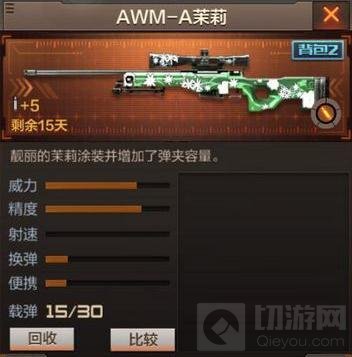 如果有狙击枪被改装,以小编玩过枪战游戏来看AWM系列的狙击枪被改装的可能性最大,再来是巴雷特。AWM-A茉莉与AWM原本的外观相差很大,你对AWM不了解的玩家看到整把枪身纯绿色再搭配白色的茉莉花,会让新手玩家以为很厉害的样子,不过与AWM初始属性对比,确实提升了不少,值得玩家们将AWM-A 茉莉归入自己的装备中!