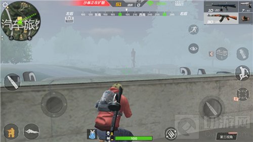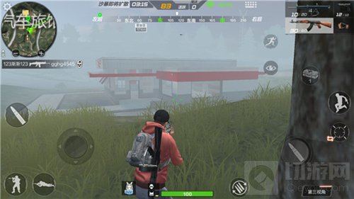 和餐厅不同,加油站的楼顶是可以上去的,并且楼顶位置也有不少的资源。楼顶周围是有一圈围墙围住的,如果在餐厅方向有敌人的话,那这就是一个非常好的伏击点位,因为这里可以看到餐厅方向的全景。选择在这个点位的话一定要注意身后的敌人,因为加油站后面是一个小山坡,如果有敌人过来的话会很容易发现楼顶上的我们。