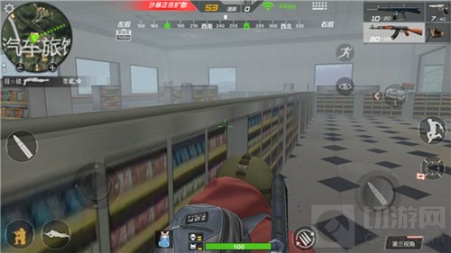 除了餐厅,在更北侧其实还有一间加油站,这栋加油站建筑的面积一点都不比餐厅小,里面同样有非常多的道具资源,所以也可以选择在这里降落。加油站的内部还有可供我们蹲点的好位置哦,如果发现周围有敌人一起降落的话,我们完全可以在加油站内部伏击他们。这里推荐小伙伴们在货架的后面位置蹲着,货架的高度正好可以挡住我们的身体,而我们又可以通过第三视角看到外面的情况。