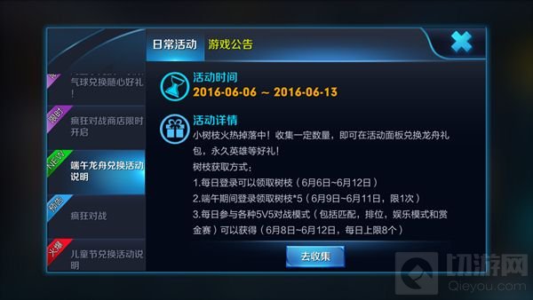 活动内容:小树枝火热掉落中!收集一定数量,即可在活动面板兑换龙舟礼包,永久英雄等好礼。