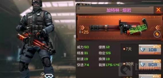 加特林是路人皆知的机枪,全自动、可快速连续发射的功能,看它的长相就知道了。哒哒哒~~哒哒哒。加特林 - 熔岩,针对数倍于己的敌军,扫射狂击,绝对保本。载弹增加25颗子弹,瞬间可以增加了25个死亡名额,酷炫的熔岩外观,引燃汹汹的战欲,让小编爱不释手。