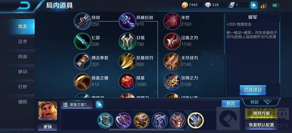 六神装推荐:抵抗之靴、暗影战斧、不祥征兆、魔女斗篷、反伤刺甲、破军