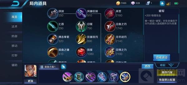 六神装推荐:巡守利斧、抵抗之靴、暗影战斧、冰痕之握、魔女斗篷、破军