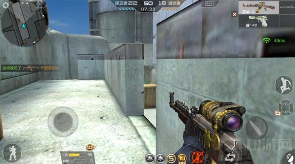 除了在平台尽头攻击敌人以外,还可以选择在围墙中间的缝隙位置瞄着敌人一侧的拐角位置。这个位置的话只有非常小的一个视野,但是却可以看到每一个经过的敌人,所以比较考验小伙伴们的手速了。如果枪法比较好,反应速度比较快的话可以用狙;如果技术一般的话建议还是用步枪。
