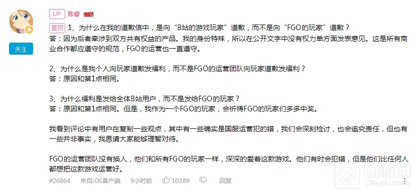 1、为什么在我的道歉信中,是向“B站的游戏玩家”道歉,而不是向“FGO的玩家”道歉?
