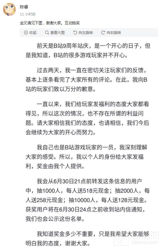 为此,B站CEO陈睿于今日凌晨发长文向玩家致歉,并且表示将以个人身份给大家发福利,奖金由他个人承担,金额从518元到128元不等,总金额超过200万元。