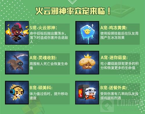本次《野蛮人大作战》新版本上线的6个宠物为,S级的火云邪神,A级的鸡冻黄黄,A级的灵魂收割,A级的迷你菇皇和B级的硕美科以及B级的送餐外卖。他们有收输出,有辅助,有控制,有移速,任君挑选,那他们的具体能力是哪些,推荐的携带的随宠是哪些?别急下面就告诉你!