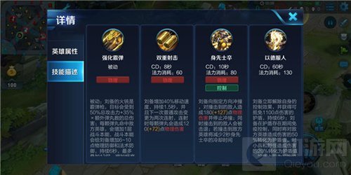 刘备增加移动速度并使下次普通攻击变为两次连射,对敌人造成额外伤害。此技能可用于追击敌人以及逃跑。