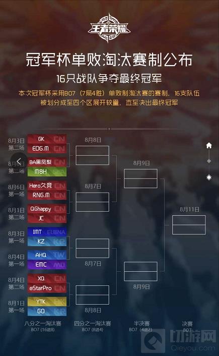 本次冠军杯采用BO7(7局4胜)单败制淘汰赛的赛制,上述16支队伍将划分成四个区进行捉对厮杀,只有胜利才能一直前进。中外战队鹿死谁手,敬请期待!