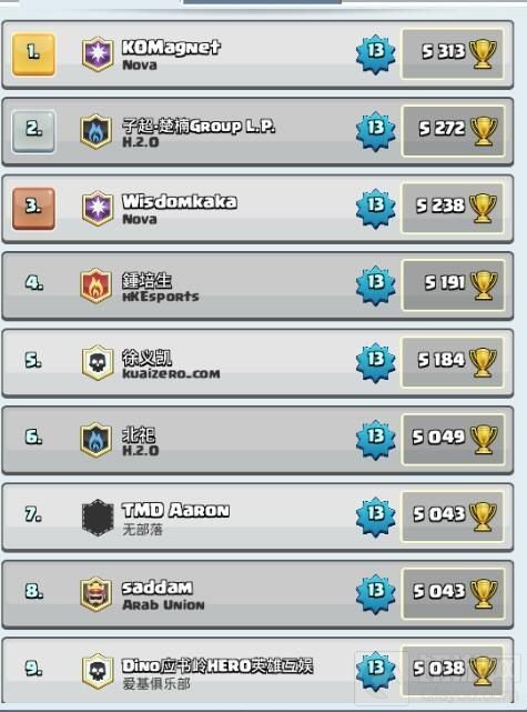 众所周知,《皇室战争》排行榜上一直都是国人霸榜,但是在不久前结束的《皇室战争》新赛季上,来自Nova的KOMagnet打破了这一现象,成为冠军。上届冠军子超-楚楠排名第二,而在前十当中,钟培生第四,应书岭第九。