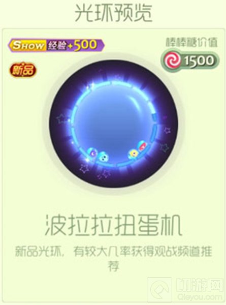 波拉拉扭蛋机光环外形光芒四射,看上去像是魔法球,里面装着球球吉祥物!该光环可以让球宝的show值增加500点!