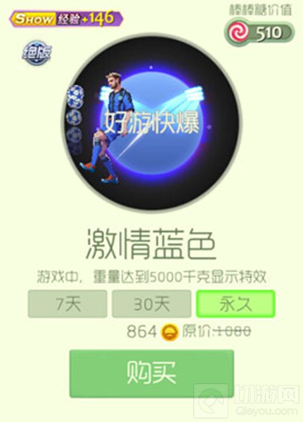 激情蓝色光环外形看上去是一个踢足球的动画,是暑期运动版专属光环!该光环可以让球宝的show值增加146点!