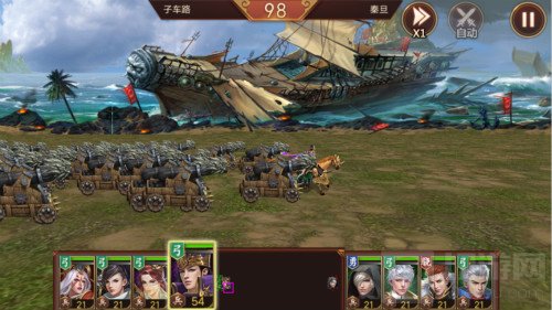 战斗中各个武将具有2种攻击模式:普通攻击、技能攻击。如何将两种攻击模式有机结合,发挥最大战斗力,是玩家战斗的重中之重。上方的快进按钮具有战斗加速功能,选择不同的速度可以控制战斗的节奏。
