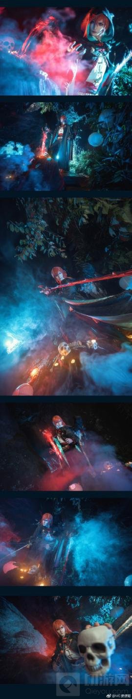 由ME便便哥创作的段剑cos,幽暗的色调一如段剑给人的印象,深度贴合角色的心理。浓重的眼妆、不苟言笑地神情、以及作为道具的骷髅头,烟雾缭绕间平添几分神秘莫测的诡异感。