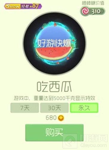 吃西瓜光环外形像一个西瓜,周围全是夏天的味道,冰力量十足!该光环可以让球宝的show值增加87点!