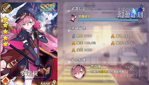 萝莱拉的必杀技“恋之锤”对前方大范围敌人造成伤害,初始倍率2022%,每级成长18%,满级可达到3620%。并且大招是一段伤害,不像目前的其他SSR一样是多段伤害,这是一个隐藏的优势,当60级获得满血必暴击的手套时,会得到质的提升。