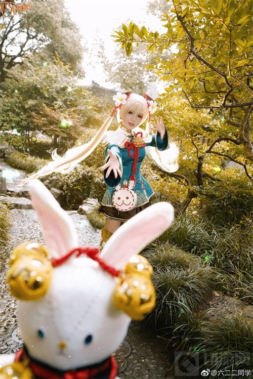 从图片中可以看到,coser六二二同学扮演的聂雨可以说是非常可爱了,所穿的服装和背的圆形小包都走的是萌系路线,而怀中抱着的兔子玩偶福萝卜,则是聂雨的秘密武器,可以变成巨大的兔子妖灵。