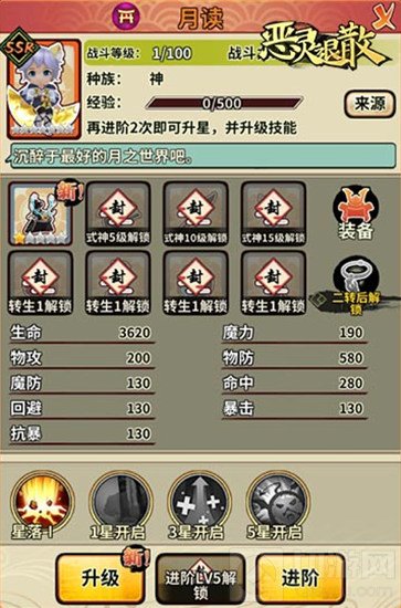 或许是处于对错杀保食神的愧疚,相比于输出,月读的技能更注重助攻。主动技能“星落”能够对范围内3个敌人造成100%的伤害,并降低所有敌人防御20%;被动技能“月灵祝福”在攻击时,有40%的几率增强2名受伤最重己方防御10%;“暗影侵蚀”在攻击时,有40%几率降低攻击目标闪避10%;“月神之灵”可以使攻击增加10%,暴击值增加50,并能免疫控制。