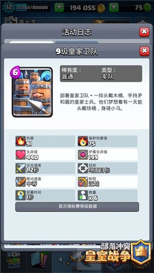 卡牌属性:皇家卫队是我们在7阶(皇家竞技场)中解锁的全新“普通军队卡”,圣水消耗上需要6点,属于中高费的兵种。这张卡在使用上属于大型人海类似,数量上高达6个!且每个兵种不但自身的生命力会相对较高,还会有“生命护盾”的加成保护(只有击落了护盾才能够攻击到本体),攻击的属性上皇家卫队目标为地面敌军,且属于近战。实战中会比较惧怕敌军偏远程AOE卡牌和空战属性的兵种。