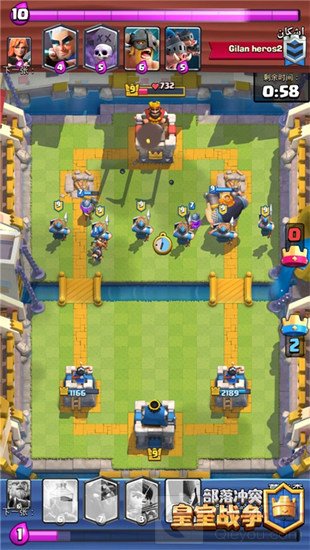 皇家卫队在使用上会成全屏幕的“横向一排”形,而非集中出现。这个形式的出场也很特殊,使用时在对抗敌军两路的敌军时会很强势,非常适合两路进攻或防守的战术。其次由于是横向一排,即使我们攻克了对手一路防御塔,也无法在中路区域打出,当攻克敌军两路防御塔后,才能够在中场使用。
